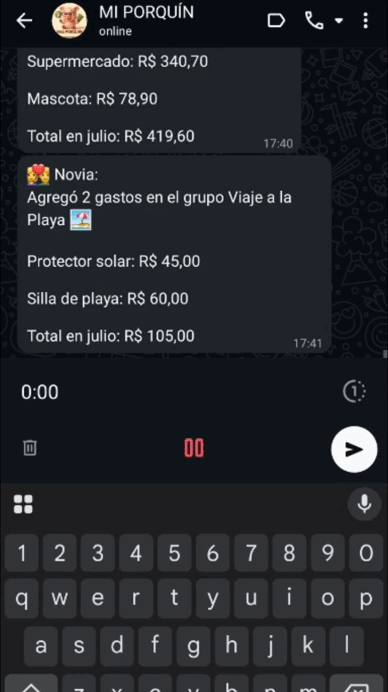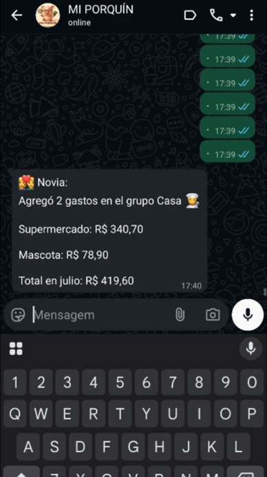 Ejemplo: creas el atajo "mercado70". Al enviar ese texto, Mi Porquin puede registrar automáticamente "Mercado – R$ 70,00" ya categorizado. Eso ahorra tiempo y hace el registro mucho más rápido.